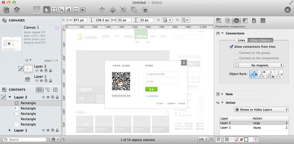 在制作交互模型时,加入对点击事件的处理能很方便的演示我们想要的效果,Omnigraffle 支持的脚本不多,没有鼠标滑过,没有动画,只有点击跳转和点击显示或隐藏图层两种,对于一般的原型演示足够用了,尤其是图层显示隐藏,例如可以像图中所示将浮层中的内容放在图层2上,用关闭按钮用来触发隐藏,来实现图示效果。