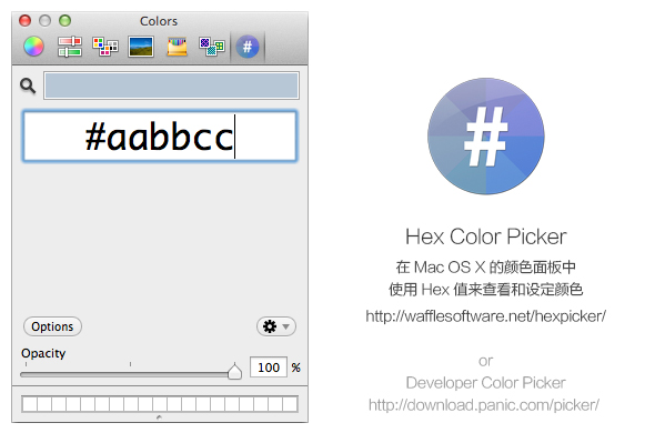 Mac 自带的取色器只能在已有的颜色集里选或是靠肉眼在色盘里选,非常不严谨,还好有爱心人士提供了 Hex Color Picker 和 Developer Color Picker 插件来帮助我们精准设定颜色。
