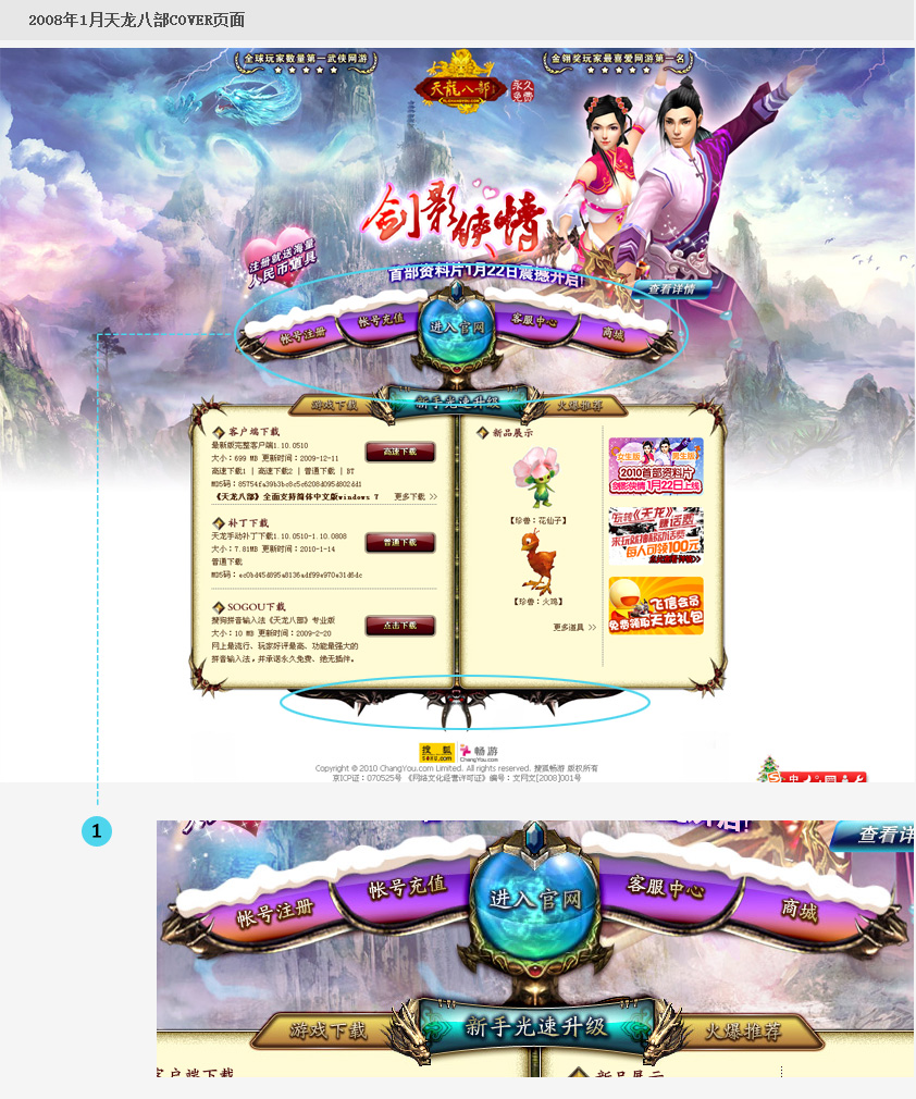 该页面中的导航摒弃了页顶的常规设计,而采用居中与下面信息板块相协接,重金属包边和水晶质感的按钮,应该是当时比较注重的。