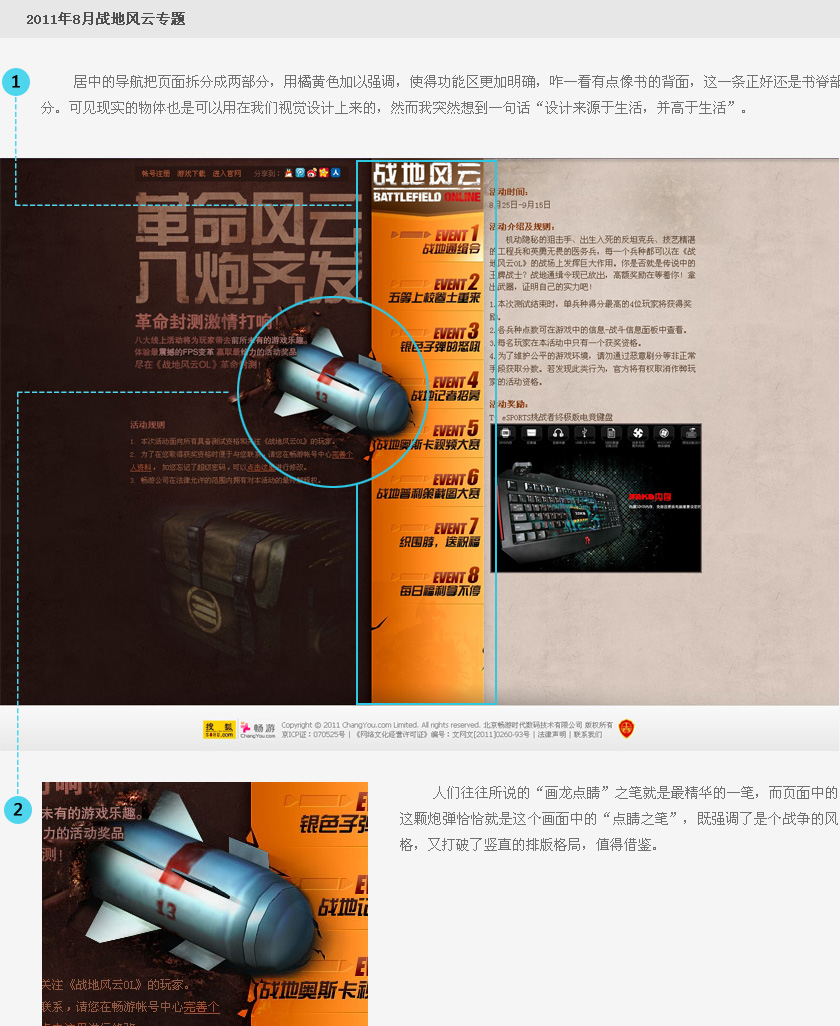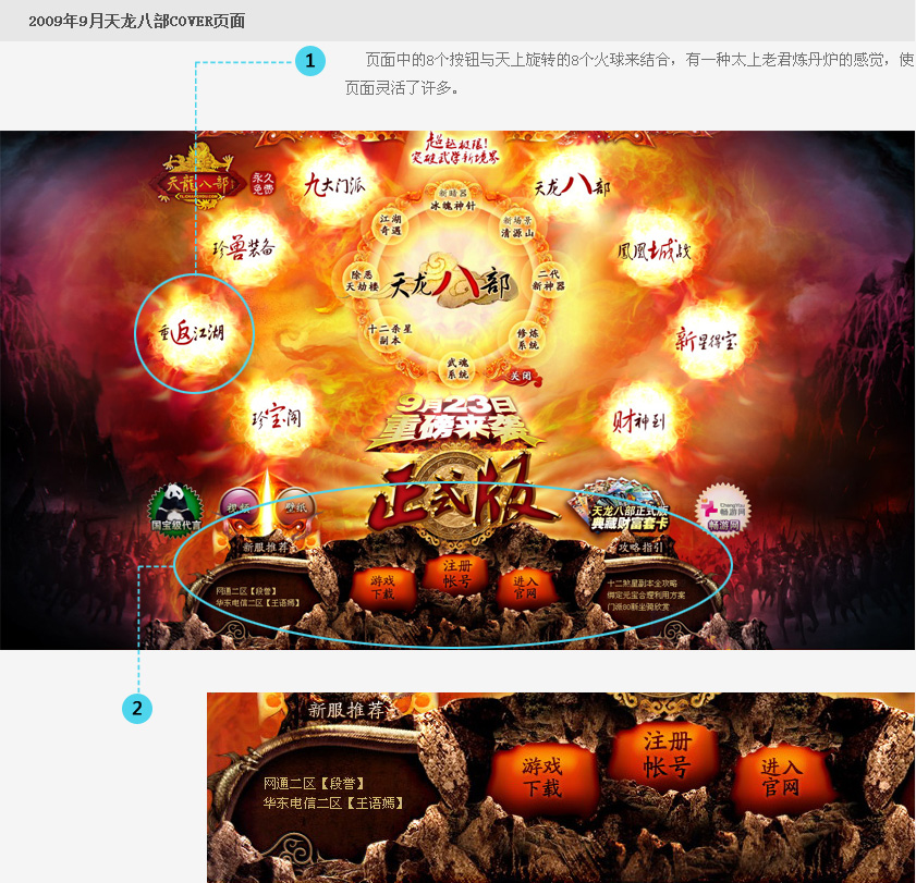 从页面当中大量的火球看出这期是要打火爆震撼而具有杀伤力的感觉。页面下方把导航与公告信息通过金属铜与大石块穿插后留下的设计区域整合了信息,可谓是既整体又与页面震撼想呼应。