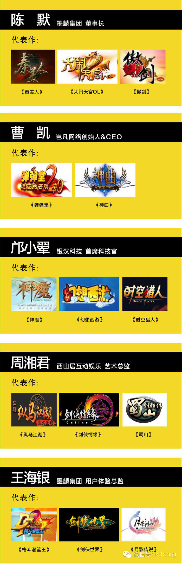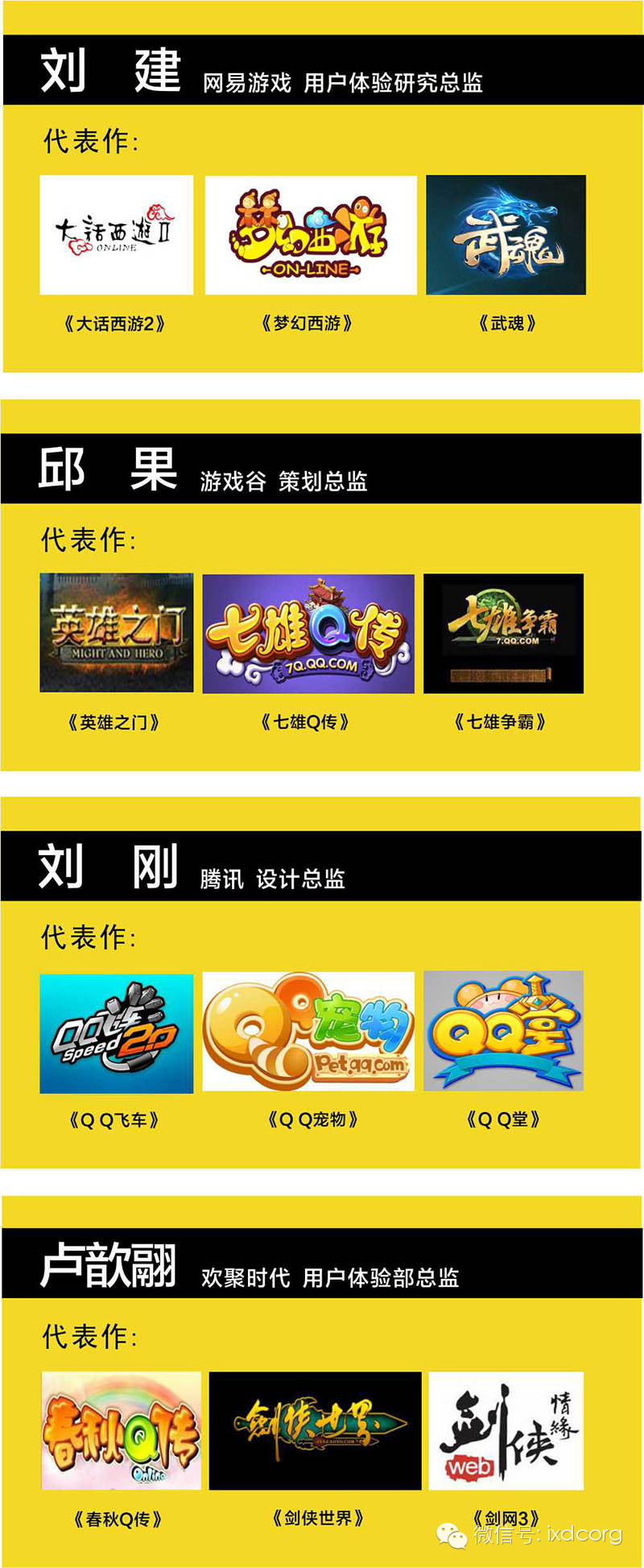 邀请的主讲人都是一线企业精英人物聚焦游戏体验,跨界跨领域。《战龙三国》、《大闹天宫OL》、《神曲》、《仙剑奇侠传三》、《剑网3》、《七雄争霸》、《天龙八部》、《梦幻西游》、QQ飞车等游戏的金牌制作人、用户体验总监、主策主美等悉数登场。更有虚拟体感技术专家、数据市场研究专家等的大力支持。