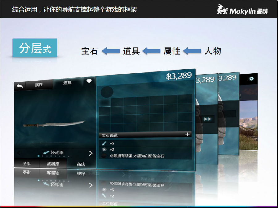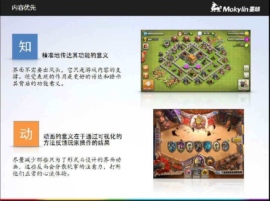界面不需要出风头,其实它只是游戏内容的支持,应该是更好传送和暗室背后的功能意义。我觉得UI界面应该减少自己的存在感,当用户想起你来的时候你再出现就会比较好。动画的意义是通过可视化的方法反馈玩家操作的结果,这个其实在手机游戏上,我觉得非常重要。