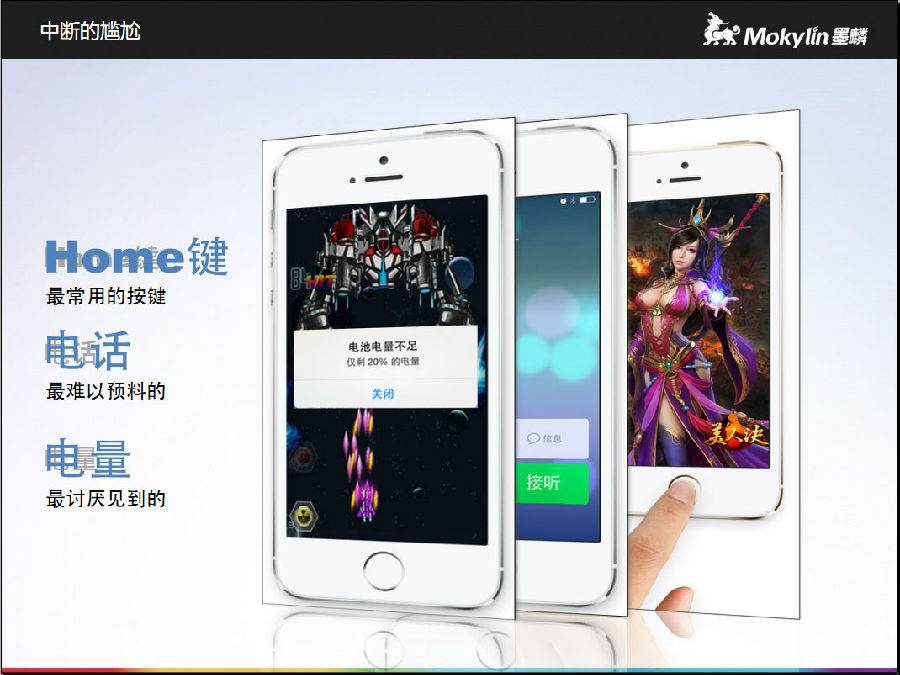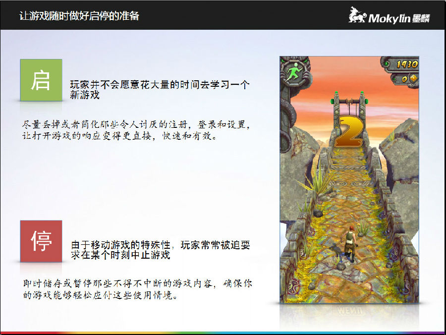 电话在玩游戏过程中,随时有可能会打进来,你玩着玩着也随时有可能会进入电量不足的提示。所以手机上中断感是比较强的,你的游戏极致需要设计成满足这种中断感才行,不要每次一中断又重新进入游戏,这种来两次以后用户就再也不会进入你的游戏。