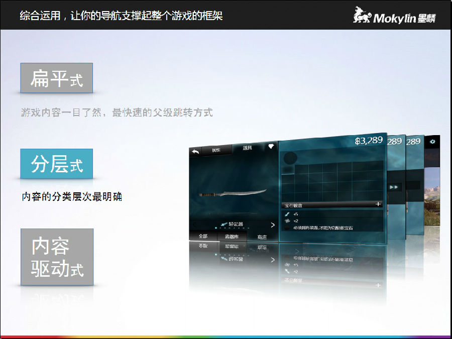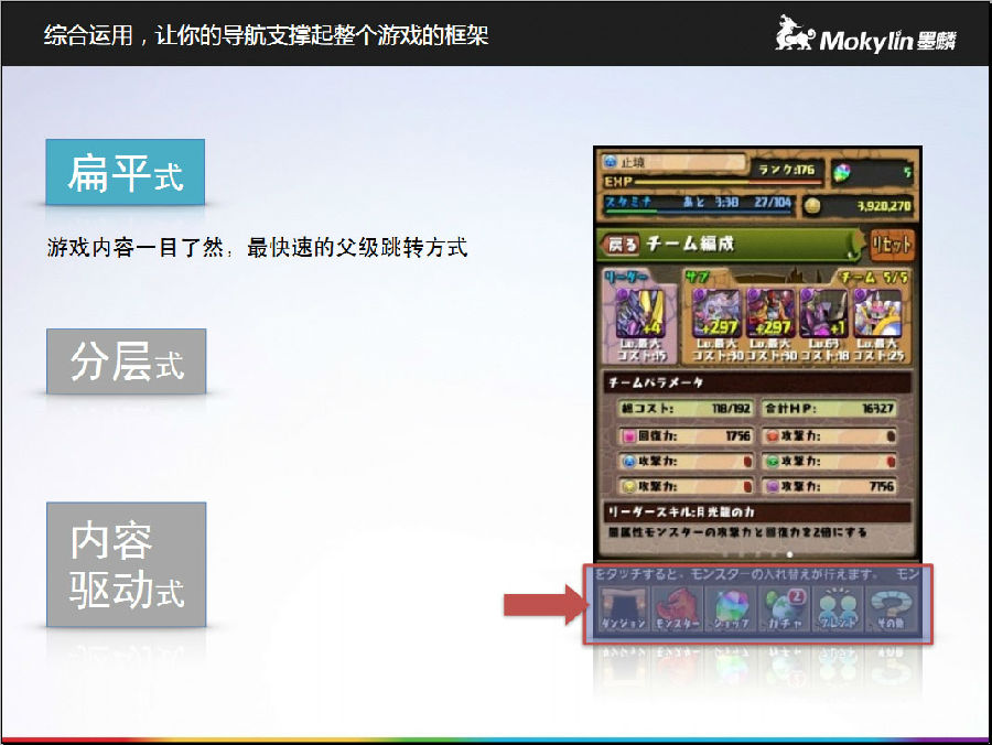 手机界面导航,大致归纳了一下扁平式、分层式、内容驱动式,大家习惯的卡牌是属于扁平式设计,最底部罗列一堆按钮,主要功能按钮都在这里,用户对游戏学习成本会比较低一点。