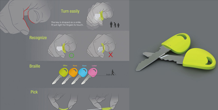 最常见的防呆设计在电脑中,为了让普通用户在组装电脑时不会出错,相关零组件大都有形状相符的防呆设计。生活中也不乏防呆设计的应用,下面这款2013年iF获奖作品微笑钥匙(Smile Key)就通过防呆设计解决了关于钥匙的4大难题。自然的弧度,更加贴合拇指和食指,用着更舒服;更容易分辨钥匙的朝向—再不用去记忆哪面是正确的朝向,自然贴合拇指与食指的那面,便是正确的;钥匙平放的时候,因为这弧度,更容易被拿起来;钥匙上面有数目不等的凸起小颗粒,用于区分谁是谁,比如说,1个小颗粒是办公室的,2个是自家大门的。这在晚上看不到的时候尤其方便,再不用一串钥匙挨个尝试了。
