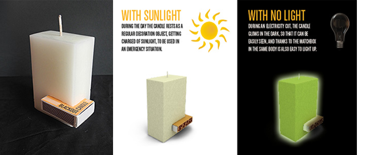 夜间的提醒也很重要。停电了,却怎么都找不到蜡烛?澳大利亚工作室Den Studio带来的荧光蜡烛(Blackout Candle),通过防呆设计试图解决这个问题:它采用了特殊材质的石蜡和发光粉混合制作,白天发光粉吸收光的能量,晚上发出荧光;其次,造型方正,在底部有个小开口,刚好可以塞进去一盒火柴——于是,即便突然的停电让你措手不及,但是找到了蜡烛,你就能找到火柴~