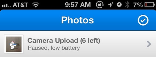 当电量不足时,Dropbox会自动停止正在进行中的照片上传动作。这个贴心的设计让用户避免了因上传而耗尽电量手机关机的囧态。