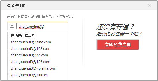 用户在操作时不会保持高度的谨慎和耐性,所以必要时要帮助用户思考。帮用户想他没想到的,帮用户想他所需要的。如新浪微博使用邮箱做为登录名,用户在输入@ 后,将会出现输入建议,输入建议里有常用邮箱的后缀以辅助输入。此时用户就可以直接选择无需输入。