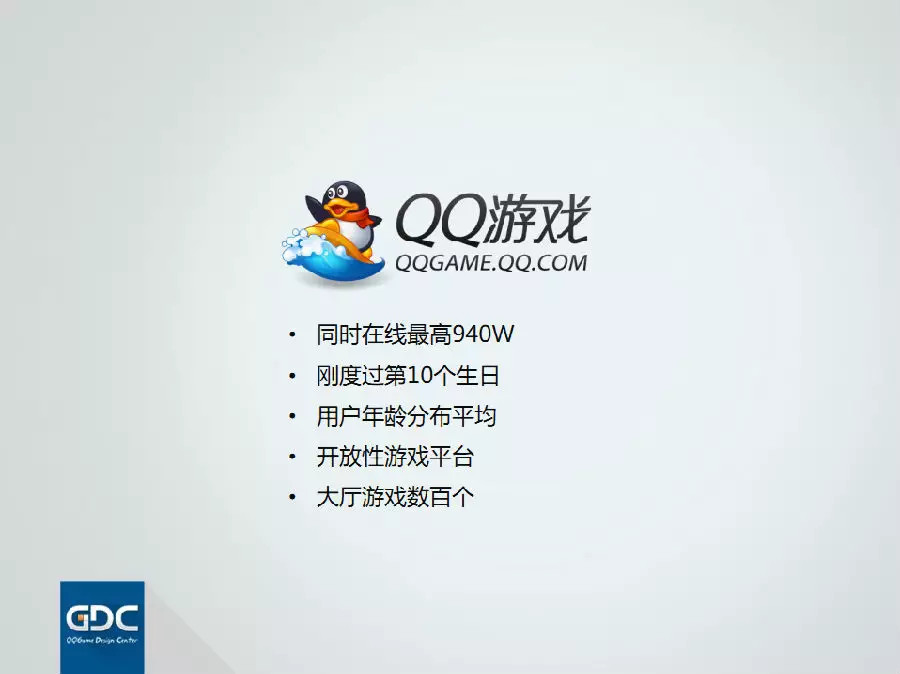 给大家简单介绍一下我所在的QQ设计团队做的一些事情,我不知道在座同学有多少人了解到我们这款产品,其实我们QQ游戏目前应该是国内最大的一个休闲游戏平台,我们同时最高在线已经达到940万。我们团队主要为综合性游戏产品来服务,团队工作内容包括了游戏平台的搭建,以及在我们平台上面的重大的游戏产品的研发,包括我们刚刚在微信上上线的天天德州,还有大量的客户端以及Web端的游戏,并且我们负责QQ游戏整体品牌的建设。其实我们会是一个偏运营的产品平台,所以说我们大量工作也会涉及到运营合作。
