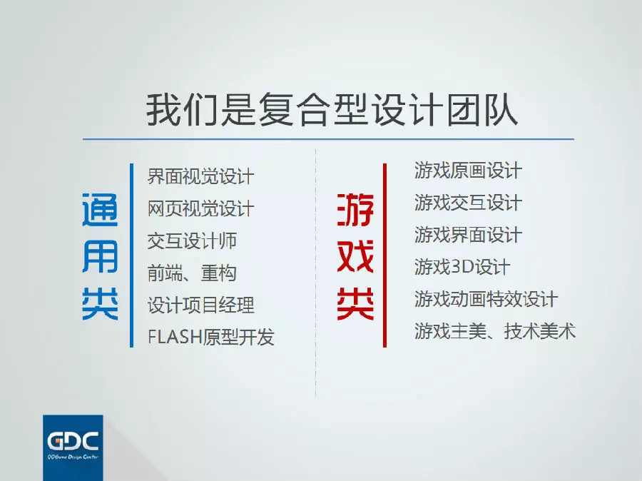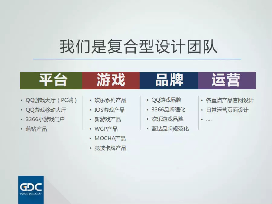 我们团队是一个复合型的设计团队,我们的工作内容包含各个层面,总的来说其实我们设计团队分工主要是分为两块:一块是比较偏通用类的设计,以我们大屏以及蓝钻产品为主的服务性的产品;另外一块是以游戏这一块研发为主要导向。总的来说我们团队和其他的一些游戏团队比较会有一些不同的,整体来说,我们会更关注一些用户的行为,以及他的一些动机,以及这之间关联性的东西。