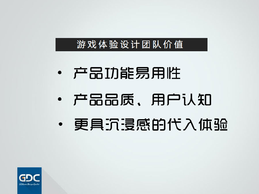 所以说其实我更喜欢把我们的团队叫成作游戏体验设计团队。做为一个游戏体验设计团队来说,他在项目中的价值,首先我觉得它去确保我们游戏产品功能上的易用性,这是最基础也是最基本的,第二块我觉得可能是通过我们一些设计产出,能够去体现我们整体产品品质,能够形成用户心里更深层次的品牌认知。最重要的,其实也就是说,我们担负的责任是让它更具有沉浸感,沉浸感今天听到非常多的嘉宾有反复的去提到这个词,首先我们来看一下,作为游戏产品它的基本特性。