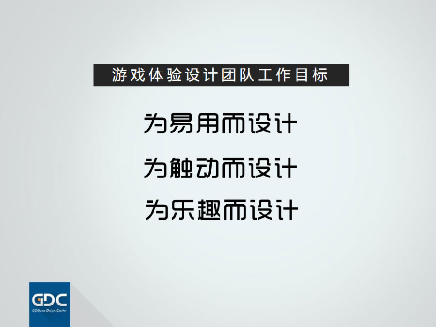 它具有本身游戏特点,并且它必须作为一个艺术品,有一定满足玩家欣赏需求的,作为网络游戏来说,它会更多的去重视社家方面的一些相互的交互作用。其实综合这些特性,它会给我们用户,也就是我们玩家以各种快感,这里面主要的来说,可能是他在游戏里面个人的一些技能,以及他的心里认知的成长感,并且他能够通过我们美术和音乐去体验到我们带给他的艺术感,并且他能够在游戏过程中和其他玩家竞争,来形成这样一个竞争感。所以我们整体游戏产品的形态,主要是要去注重他在好看、好玩、好用这几方面的体验。我们体验设计团队的工作目标,也主要是要以这样三个点去做重点的突破。今天主要给大家分享的还是触碰。