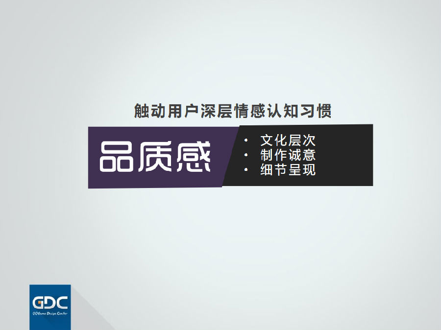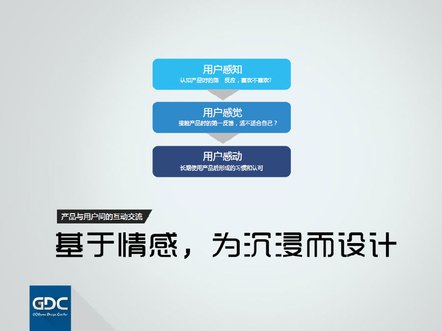 说到情感的认知,其实一般来说,玩家他会经过这样三个步骤,首先他从接触到这款游戏开始,他会有第一眼感官,用户的感知。然后他会判断这款游戏整体风格,是不是符合他的世界观,以及符合他的价值审美观。如果说他接受了这样一个基本条件,他就会到达感觉的层面。他具体使用的过程中,他可能会更多关注到他的一些应用性,新手引导,他能不能比较好的去融入到这个游戏。经过种种体验后,这也是我们最终要达到的目标,也就是说我们要达到一个让用户最终能够感动,并且能长期留下来的目的。