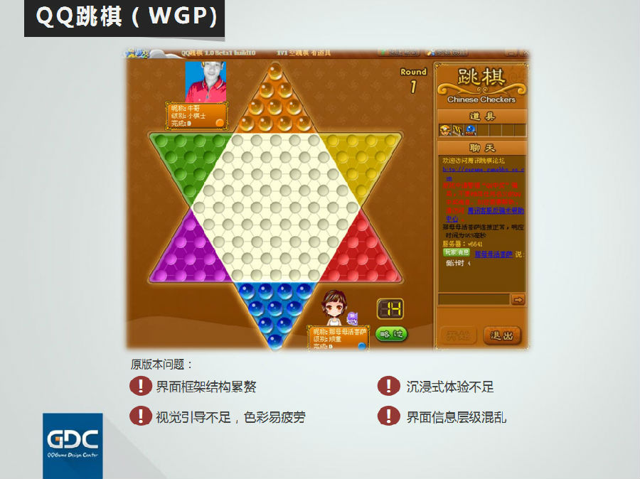 这里给大家举一个案例,我们的QQ跳棋的改版,这个是我们2005年老版的QQ跳棋,它有非常多的问题。首先我们对这个目标用户的定位,我们通过非常多在运营平台上面得到的一些数据,发现我们目标用户,大部分都是70、80后为主,我们对这些用户也进行了一些调研和访谈,发现他们来玩这个游戏最主要的目的,本身来说他们是在童年生活中,有这样的一些玩跳棋的经历,所以在现在这个环境中,他可能更多是希望,通过网络游戏形式,来找到他以前玩跳棋的感觉。所以说我们对我们目标用户的定位,现实世界中有过跳棋经验的玩家。我们这部分产品与众不同之处是什么?主要是针对他玩过跳棋这样的目标点,我们设定了我们的目标,我们是需要触及到他的情感,他玩过跳棋的童年回忆。