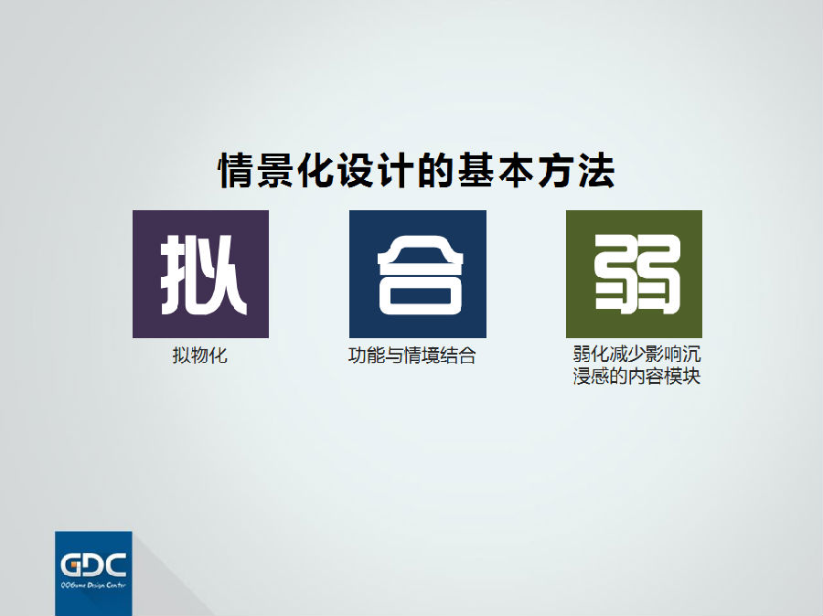 我们的解决方案就更多是从情景化设计这样来达到我们的目标点,对于情景化的设计,我们也主要是列了三种方法。一块让他更具像化,唤起他深层记忆的认知。第二块把里面功能和举起场景结合。第三块我们要弱化他玩这个游戏过程中一些影响到他的内容和模块。
