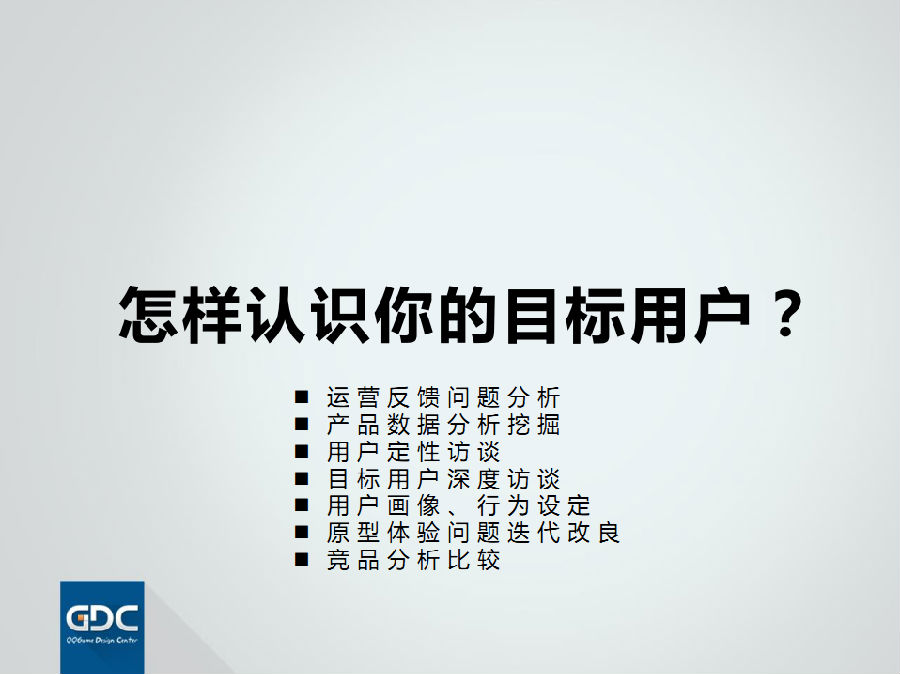 回到刚才的问题,我们目标用户是谁?以及我们如何认识你的目标用户。针对这一点,我相信有非常多的话题可以聊,之前也有非常多的同学,已经对用研这一块做了解答。这里我不做太多的解释。我们主要就是通过这样几个方法,来得到我们整体产品定性的目标用户的分析。可能我们会更多的去看我们在玩游戏的这些用户,他们的游戏目的,我们在这里面主要的需求是什么?以及我们可能也会找到市场上其他的一些竞品,来看一下他们和我们的区别是怎样的。