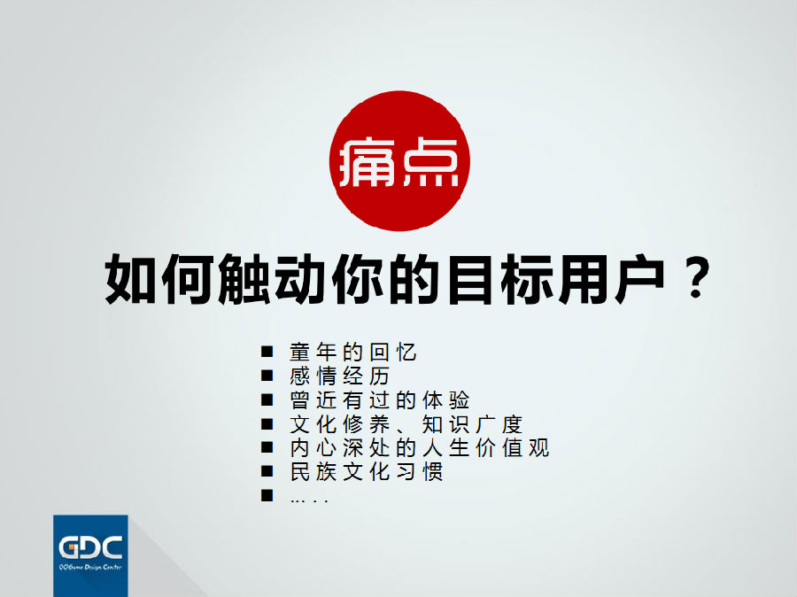 回到我们的主题,我们如何才能触动我们的目标用户?总的来说我觉得就是要找到我们用户的痛点,就包含了刚才我们的邱果先生给我们分享的,他童年玩游戏时候的一些回忆,以及他的一些感情经历,甚至他受过的教育,以及文化和价值观。