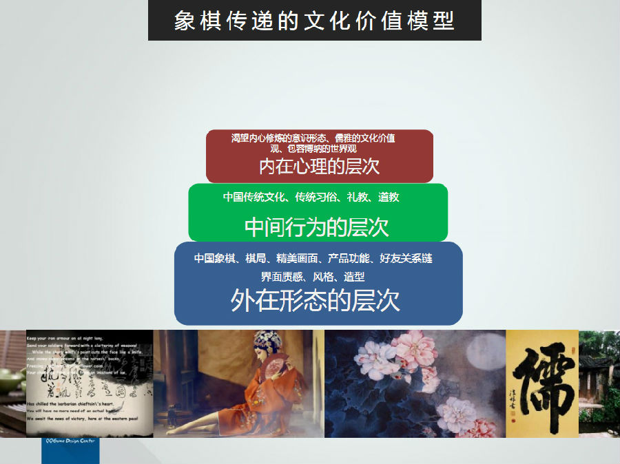 其实做了非常多的方案过后,我们始终会发现,这里面少了一些什么。我们也就更多从我们的想起这个产品,它传递的一个文化价值模型这样的层面去尽心了一些剖析,我们发现我们很多情况下,作为一个设计师,很容易去把我们一些焦点放在他的一些外在表面上,可能我们会去非常深入的雕琢这个棋子他的质感,甚至说想我们是不是直接把棋子做的更古朴,棋盘做的更真实。但是发现光这样做,是不能引起用户的触动。在这个过程中我们也进行了进一步的深化,我们去想,是不是象棋这个东西,本身是一个中国人特有的东西,我们可以把更多中国化元素加进去,这个就有了我们之前的设计,但是始终发现不能调动用户深层的情感认知,最后我们一起深入地讨论了一下,想了想,发现我们的象棋用户,他本身来说,他为什么玩象棋?他是否到非常深厚中国文化熏陶,他内心里面,有这样一个,中国文化的博大和宽容的历史在驱赶着他,所以我们针对这样一个分析,对整个象棋产品有了重新的设计定位,得到了以下的设计。
