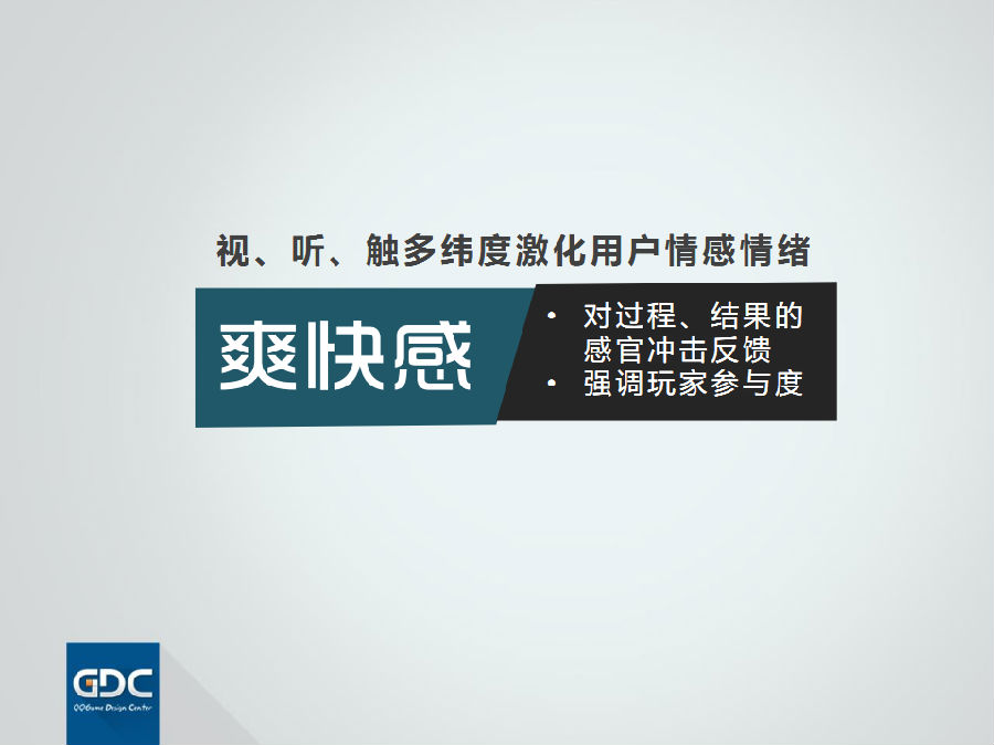 第三块是爽快感,爽快感更多是和游戏本身特性结合起来的,因为游戏本身就是一个以多媒体属性为聚焦的复杂的综合体,这一块更多的要从视觉、听觉触觉各个层面综合发力,让用户在里面玩的爽玩的嗨。