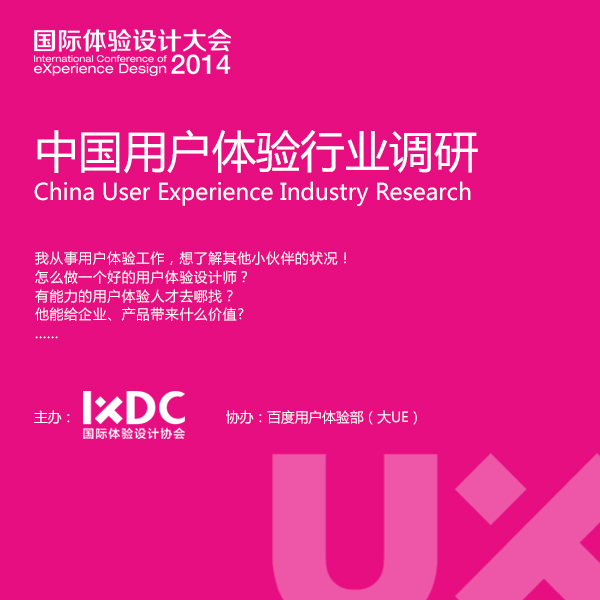 自6月3日起,国际体验设计协会(IXDC)正式开启“2014年用户体验行业调研”,联手百度用户体验部(大UE),以用户体验行业的从业者为中心,去了解和分析他们的点点滴滴,诚邀各位从事在用户体验岗位上的伙伴们参与到2014用户体验行业调查报告中来,这份报告将因您的参与而更有意义!