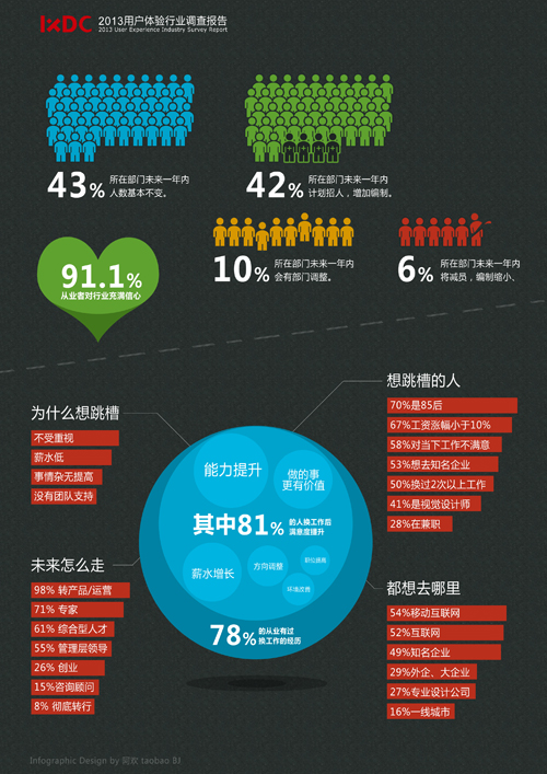 IXDC作为这个行业的组织者之一,今年已是第四年举办用户体验行业的公益调查报告活动。去年调查报告的样本来自158家以上的企事业单位,范围覆盖全国21个省会/直辖市,尤以北京、广东、上海、浙江居多。其中互联网、移动互联网行业人群占44%,民企、私企、外企的共占75%,千人以上规模的企业占19%,从全方位解读了2013年用户体验行业的人员构成、薪资水平、工作流动性以及未来发展状况,为从业者、招聘管理者以及对用户体验行业感兴趣的人提供了详细的行业解读。
