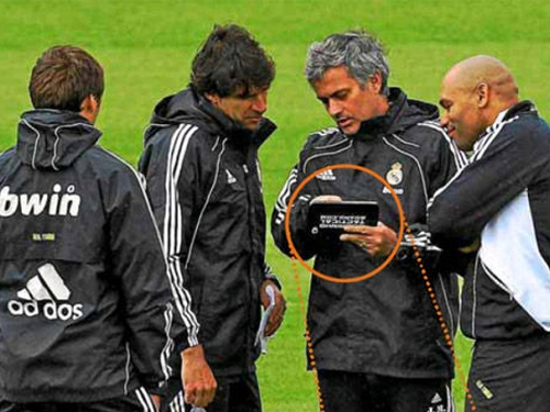 高科技引入足球比赛,最为常见的要算是教练员的指挥用具了。从年轻一辈的教练手中,我们已经越来越难看到传统的纸笔与战术板了,取而代之的则是穆里尼奥手中的iPad。