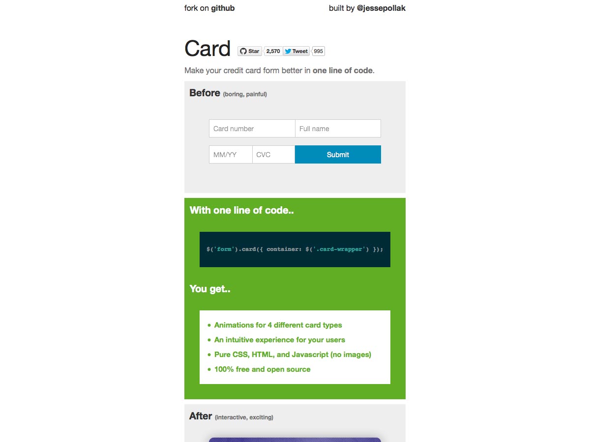Card只是单单一行代码,可以使你的信用卡表单更容易使用。它由纯CSS、HTML和JS(不带图片)写成,而且4种不同卡片都带有动画效果。
