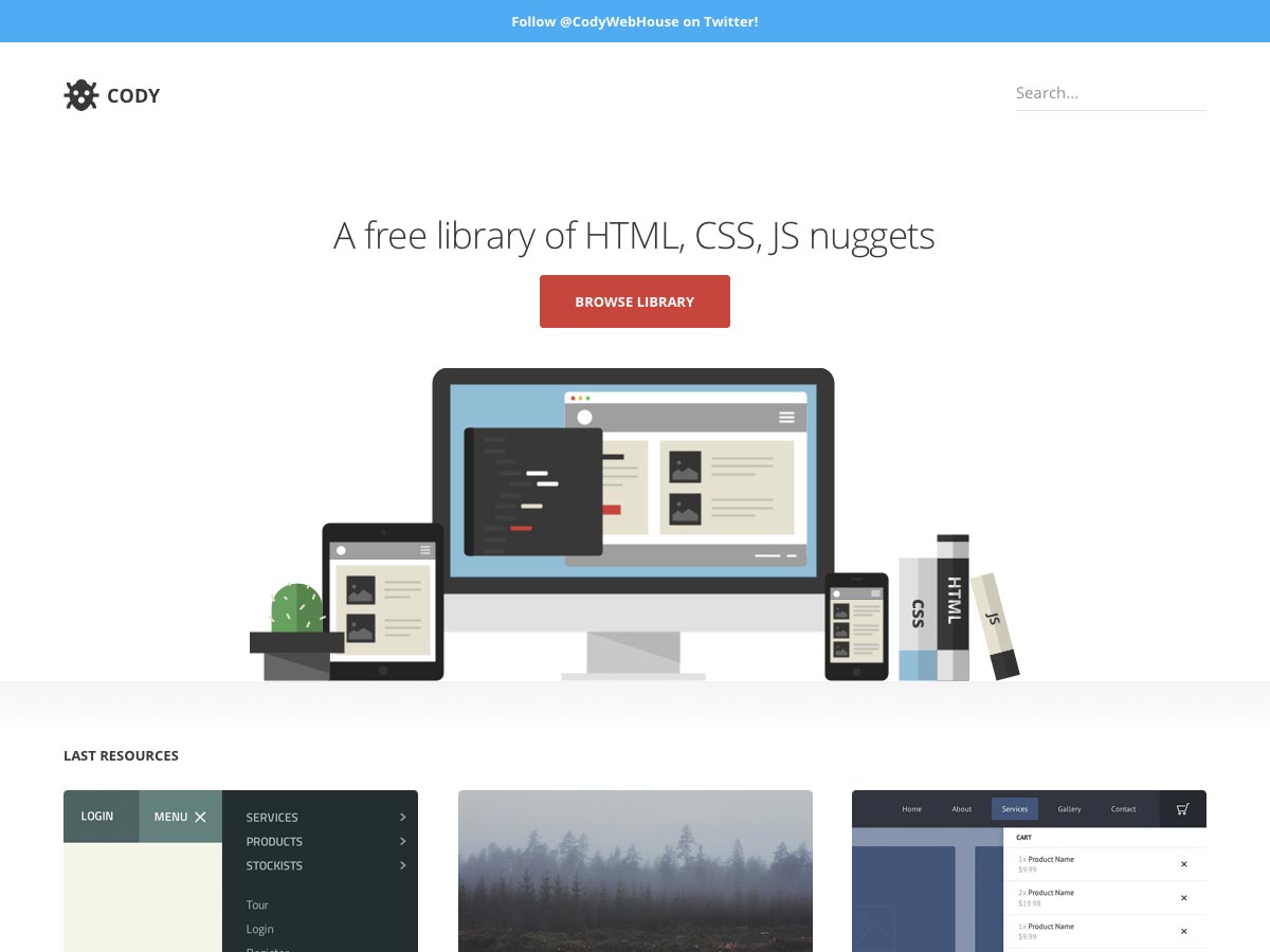 Cody是你网站免费的HTML、CSS和Javascript片段集。目前这里有导航、简介和购物车等的代码片段。