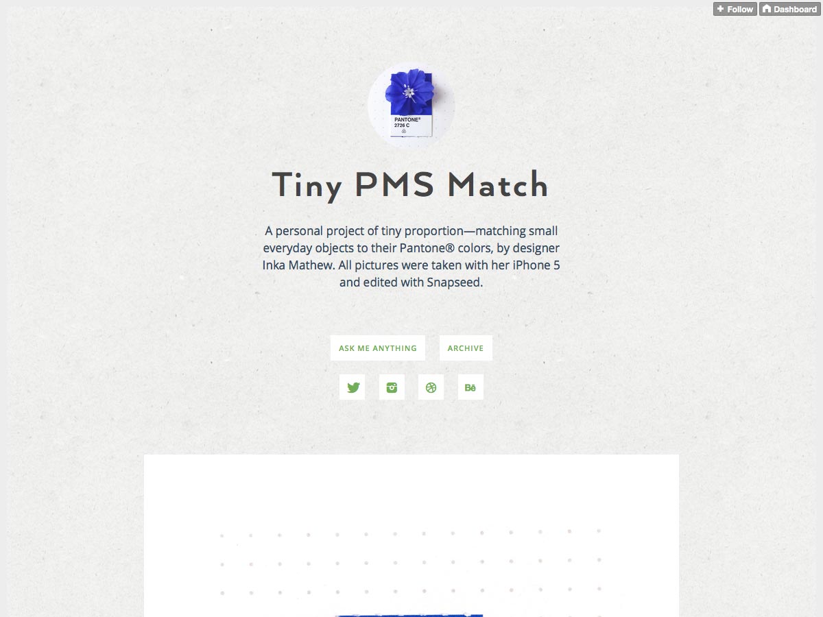 Tiny PMS Match是个Tumblr博客,将Pantone色与各种小物体联系起来。所有照片都用iPhone5拍摄,并通过Snapseed处理。