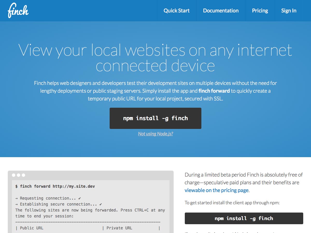 Finch是一款让用户在任何联网设备上访问本地网站的工具。安装这个app,然后获得本地项目的临时公共链接地址,使用SSL加密。