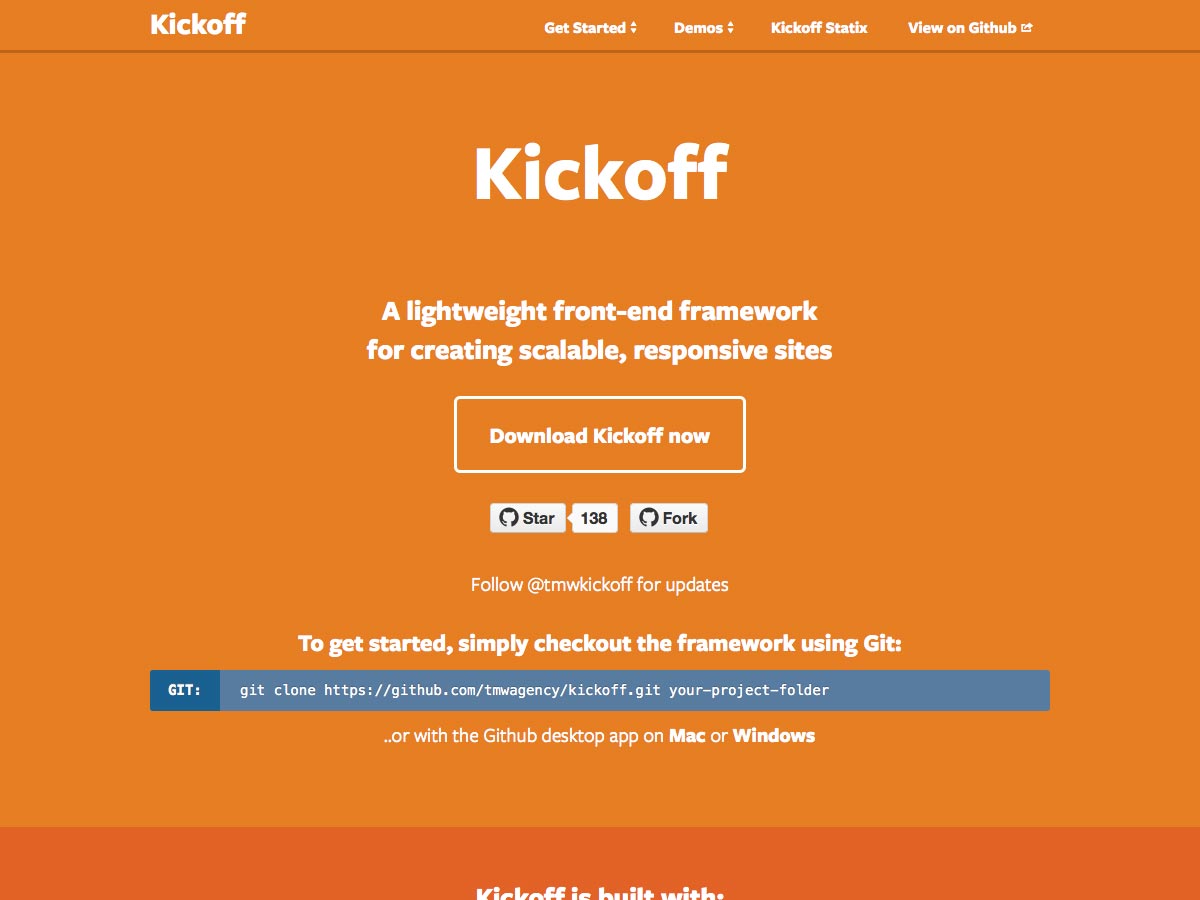Kickoff是个创建响应式站点的轻量级前端框架。它由Sass和Grunt打造而成,有详尽的文档说明。