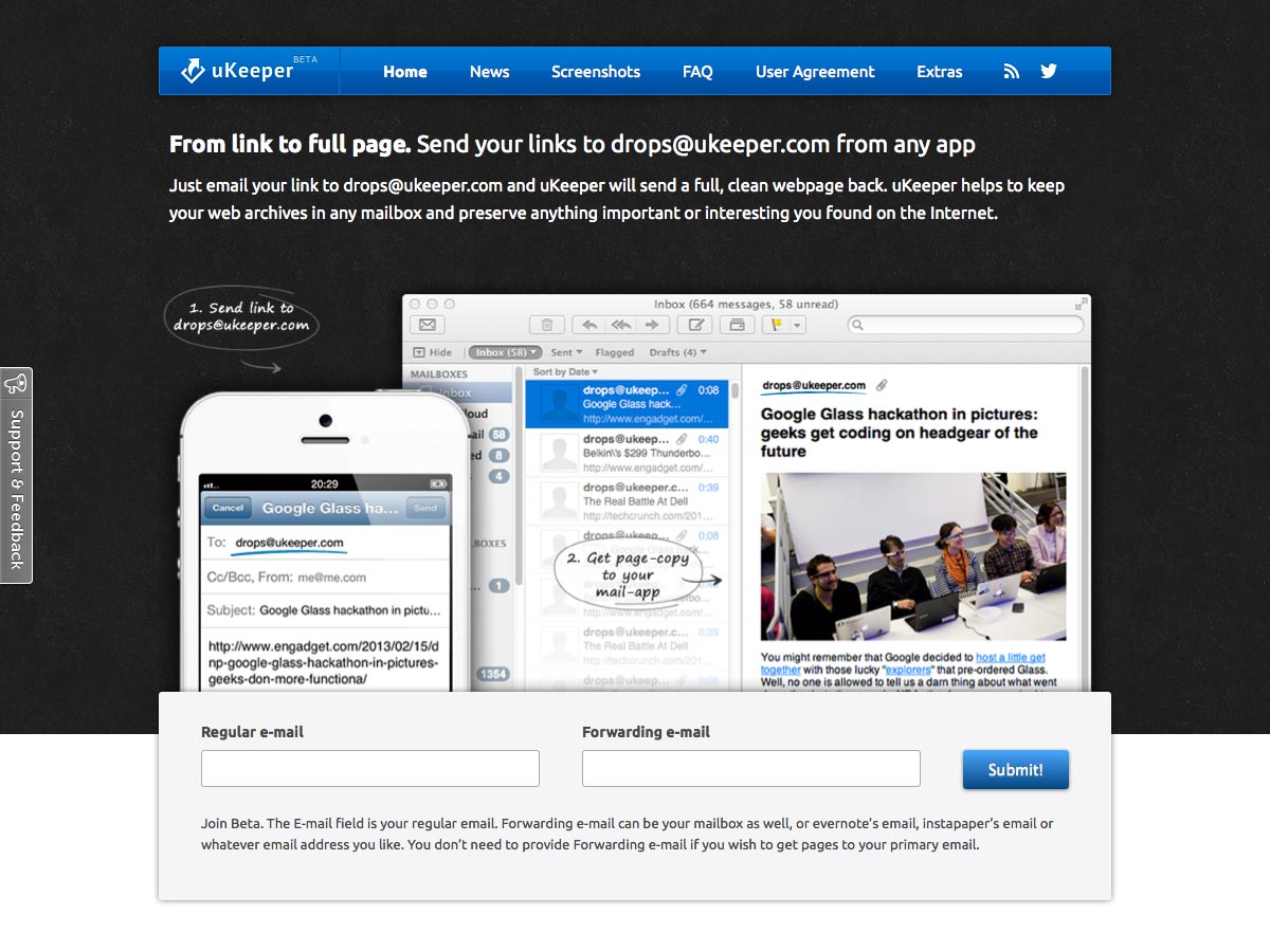 uKeeper可以很方便地保存整个网页。注册,然后给uKeeper发送电子邮件,他们就会自动发送到你的普通邮箱或是应用邮箱(比如Evernote或Instapaper)。