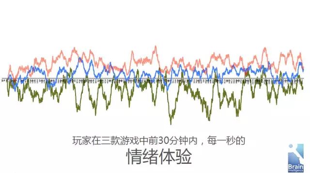 下面这张图中有三条线,对应的是在三款游戏中玩家在游戏中前30分钟的情绪体验。红色线条对应游戏月流水达到1亿,蓝色则是5千万,绿色为1千万。这三款游戏在情绪体验的设计上有着相当大的差别,也可以看到,游戏中玩家的情绪体验与游戏营收能力呈一种正相关的联系。