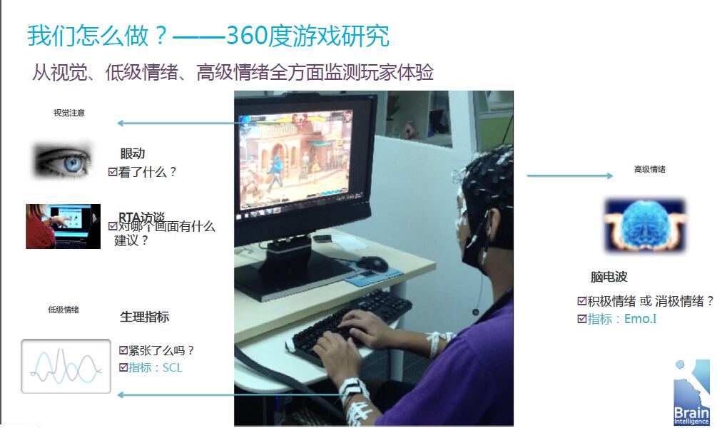 我们的合作伙伴北京师范大学拥有一个国家级的神经学实验室,使用了图示的这样一些道具,体验对象在戴上这个帽子之后接收外界视觉刺激并进行相应操作,我们就可以采集到在这个过程中接收者的脑波图形和关注点的集散图,可以看出其在这个过程中的情绪波动,进而将游戏的体验转化为可见的图表进行研究。也可用于游戏上线表现预估。