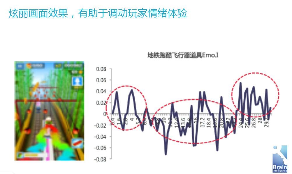 第三是游戏的画面效果,在腾讯的地铁跑酷这款游戏中,有一个道具飞行器,玩家在使用这个道具之后,角色会在空中飞行并且背后托着一个五彩祥云的飘带,这时候玩家有一个情绪体验,然后道具效果结束,玩家回到地面时会有一个五彩祥云的画面效果,并且有一个场景的转换,这个时候玩家的情绪体验也是很不错的。