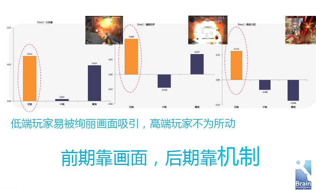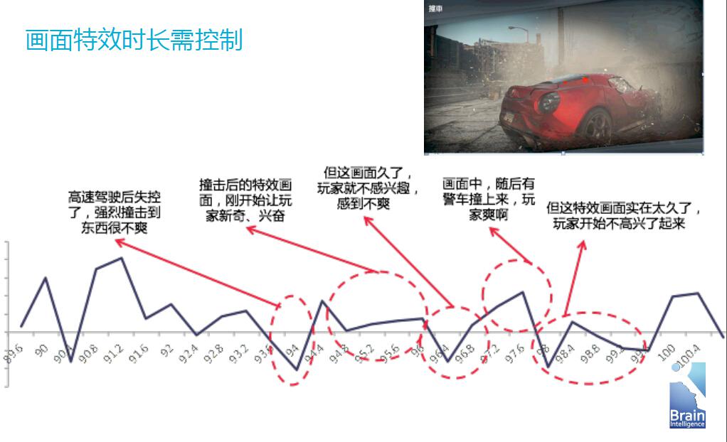 特效的带来积极的情绪体验有一定效果,但这也是需要控制的,在之前有过关于极品飞车研究,游戏中撞车效果做的非常震撼,玩家的第一次撞机体验会非常兴奋,但是持续两秒之后,你会看到玩家已经不感兴趣了,他的情绪体验在下降。之后玩家的车在游戏中与警车发生冲突,这时候也会唤起一个积极的情绪体验,但时间一长,玩家就开始不高兴了。