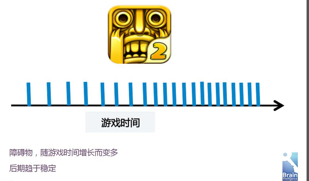 比如以跑酷的游戏为例,蓝色条就是我们在测试这个过程当中,每次出现障碍物的情况,前期障碍物比较分散,障碍物出现频率越高,
