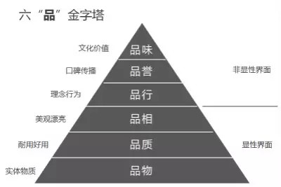 在这里我想用中国的文化来对品牌做一个解读,我们大家知道品牌两个字,为什么不会读成“牌品”,而要用品牌,它的含义是先有品才有牌。我们对跟品牌有关的一些中文词汇进行一下研究,我们会发现这里边有一个很有趣的现象,我把它叫做六品金字塔,品物、品质、品相、品行、品誉、品位,堆成了一个金字塔,而下边的这三个部分(品物、品质、品相),首先要有一个物质化的产品能够使用,这是一个基础。然后我们会对这个产品有质量的要求,要求它的生产加工的工艺符合、更好。在这样的前提下我们希望我们的产品能够美观、漂亮,这是非常重要的基础,它们的关系是层叠的关系,我把它叫做显性的界面,刚才谈到了显性和非显性这样一个概念,所以实体物品耐用、好用、美观、漂亮,这是显性界面对品牌来讲,必须要去做的事情。