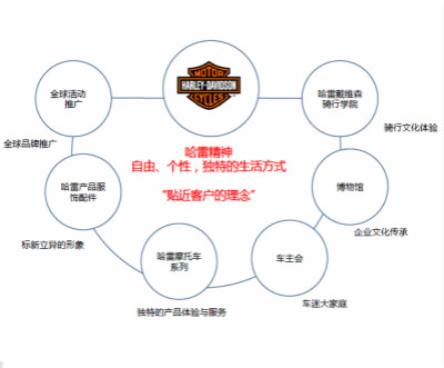 这些东西综合起来形成了哈雷的独特产品和体验的服务,在这个里面更多的是还包括他的产品、配件、摩托车系列、车主会、博物馆、骑行学院,全球的推广活动。所有的这一切目的是在于宣传哈雷的这种独特的生活方式和一种价值驱动的体验。