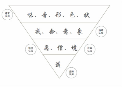 再往下我们可能会把它上升为一种你要赋予它的意义,我把它叫感念意象的概念,背后一定要有内在沉下去的东西,这些东西可能是情绪,你知道是这样一个族群的情绪吗?或者说90后中间某一个群体,90后的女生或者说白领女性,她们之间的需求是不一样的,情绪也不一样,它们内在的背景关系是什么,他们追求什么,而这个里面我们可能采用的是联想的认知和社会认知。最后我们把它归结为“道”,我们从小的道、大的道到宇宙之道,从企业来说它可能是一个品牌或者说是个人的信念,这就是我觉得是我们所构筑的一个认知的构架,从这个认知构架,我们是否能够切入到我们才全流程体验中间去思考的东西。