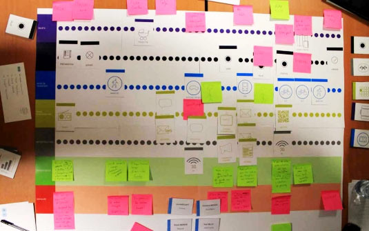 这里的案例是用于绘制顾客流程图的草稿(这个图中所指的是简易的火车搭乘)。首先是鉴定作为服务交互元素的接触点以建立的用户和组织间的关系。这个接触点可以是具体的,虚拟的,或者是人物。用户体验借由在一个序列中连结不同的接触点获得。