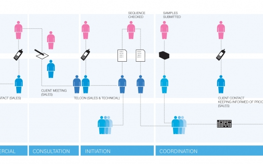 三位OGT(牛津基因技术)顾客分部接受访谈,提出OGT服务互动体验上的感受。收集的信息被用于建造三份顾客流程图,反映收集的体验,强调粘合点并做了竞品分析。结构图形化语言的使用在这里非常有用,它使得服务体验的描述使用同样的结构和标准,使得对比更加方便。