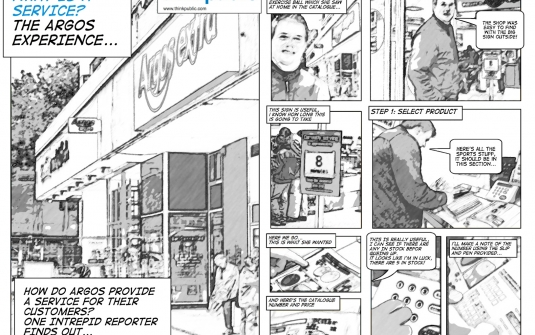 Thinkpublic 在Argos通过三页漫画展现了整个服务。这种类型的故事版使得我们有发现问题面的机会。首先,视觉表现完全以用户为中心,没有提及在后台发生了什么事情。此外,图形化语言的使用-类似摄影的构图-营造了整张图片细节处的统一性以致于图像变得很难聚焦在故事讲述上面。