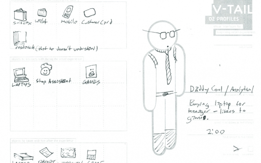 在V-tail工作坊的第一阶段,学生被问及探索一些具体的零售经验。他们花了一些时间在选定的商店,观察用户和他们的态度以便鉴定出重要的角色形象。