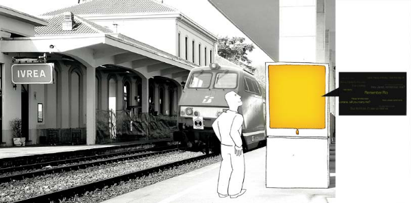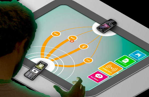在手机化身项目中,团队重新察看我们在设计设备允许我们和手机电话设备进行交互的表达方式。这张图快捷地描述了名为“分享界面”的概念。公共显示屏显示着用户发送的手机信息。这张图使用简单的视觉语言展示着潜在的服务使用场景,在拍摄背景(提供内容)上使用手绘形式(提供设备和交互的想法)。