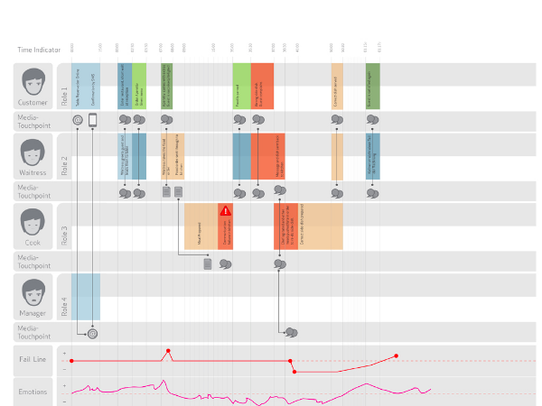 在这一类的视觉化上,这种交互关系像在经典的服务蓝图里一样一步步的被描述出来,但着重强调一些点,例如信息的不稳定性和具体设备的加入。同时也有着比在服务蓝图中更高级的综合法:呈现方法通过减少多余信息和最深层细节被简化。