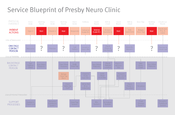 这幅图标记了病人和所有相关医护人员以及Kassam医生的就诊过程。标记服务蓝图帮助团队理解就诊体验的症结:混乱的后台进程,Kassam医生在系统中的绝对重要性,以及缺乏病患等待时间的关照等。