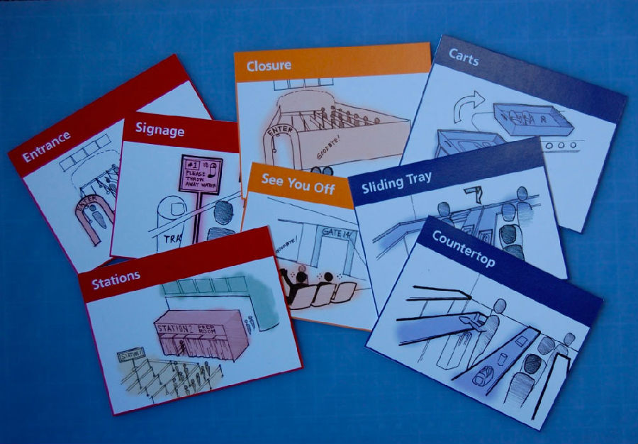 确定了项目主要设计标准后(与乘客交流,感受被控制并且跟家人说再见),团队针对每一条标准提出一些概念性的想法。这些想法被记录在卡片上用来与TSA分享,而且TSA能用它互相分享来开始关于体验的有意义的对话。