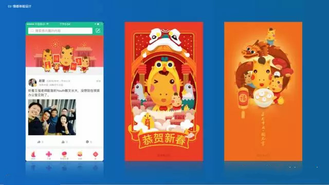 在中国人们特别重视中国传统节日“春节”这是情感设计的应用,其中节日长时间积累-产生情感经验积累,形成潜意识的条件反射:节日-情感(愉悦情感、吉祥寓意、热闹的氛围),所以在设计中要传达用户正面情感体验追求愉悦正面情绪,设计元素营造节日氛围——产生正面吉祥、喜悦情感。