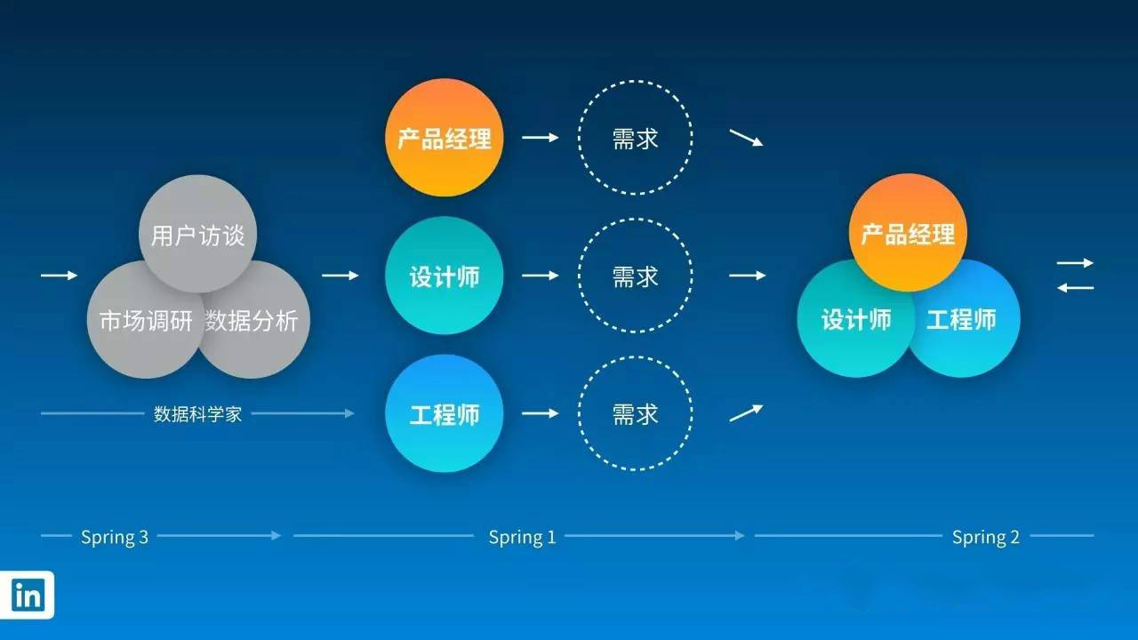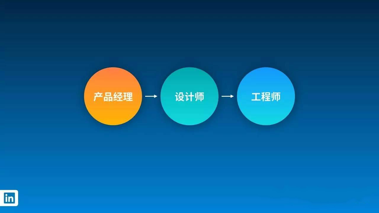 一谈起产品设计和工作流程,那就一定离不开三个重要的角色:设计师,产品经理和工程师。那么在领英的团队中,这三个角色的合作方式有什么不同呢?在曾经接触的大多数互联网公司中,设计师,产品经理和工程师的职能分工更加明确和清晰,并且多数采用瀑布流的工作流程。即产品经理提出需求,撰写产品文档;交给交互设计师,共同梳理产品逻辑和交互流程,产出交互文档;交给视觉设计师,从视觉的层面优化线框图,产出高保真的产品效果图及标注文档;再交给工程师进行开发实现,直到产品上线。瀑布流的方式保证了工作流程的规范性和效率,但是缺乏灵活度和参与性。